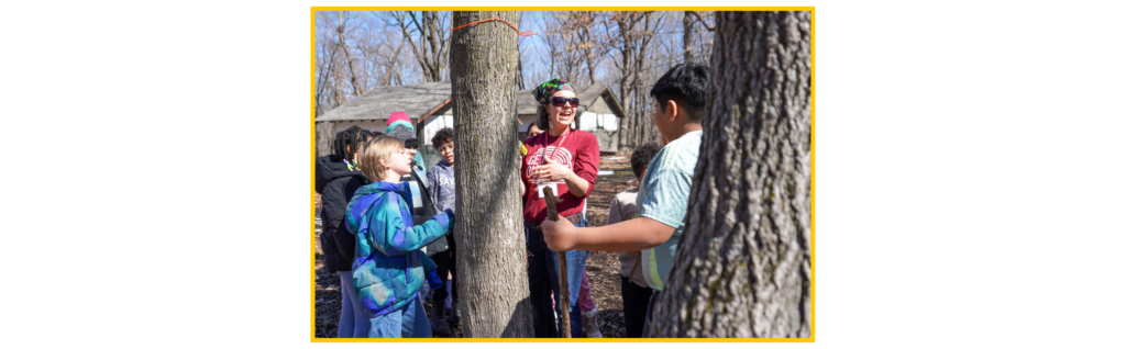 This past month, youth program participants in our field trips and break camps learned about sugarbush, installed spiles into trees, tasted the sap, and sampled spoonfuls of boiled syrup. Students learned that making syrup is no small feat, given that it takes about 40 gallons of sap to produce one gallon of syrup!